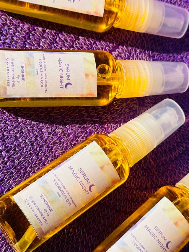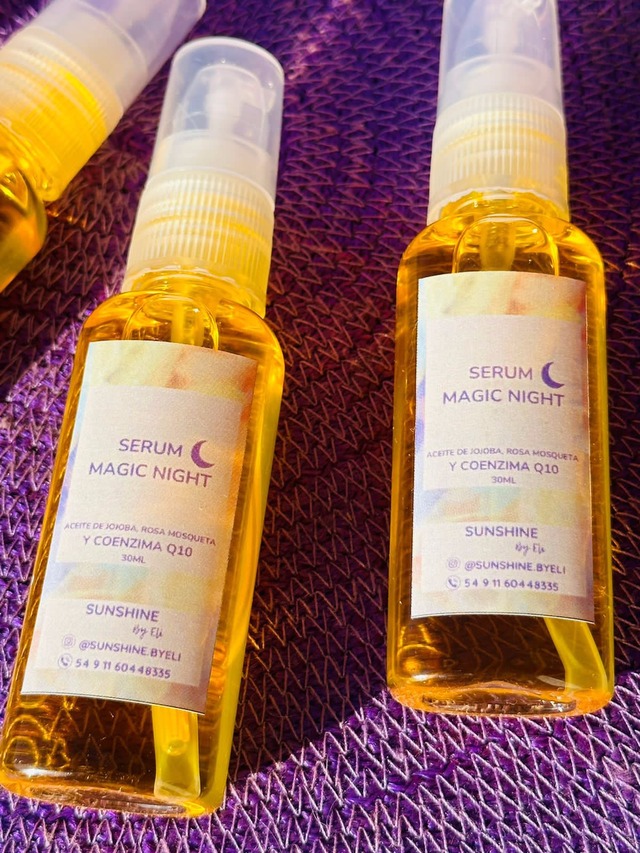 En sunshine redoblamos la apuesta y creamos el Serum Magic Night, un elixir de aceite de Jojoba, aceite de Rosa Mosqueta y coenzima Q10. Así sumamos la poderosa humectación y nutricion del aceite de Jojoba con el efecto regenerador de la piel y el estímulo a la producción de colágeno del Aceite de Rosa Mosqueta y la Coenzima Q10 que arrastra radicales libres generando efecto antioxidante.
